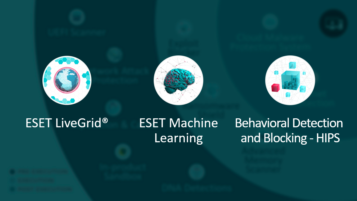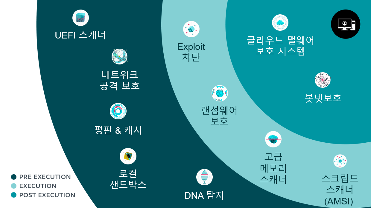 하나의 계층만으로는 오늘날 계속해서 변화하는 위협 환경에 충분하지 않습니다. 이셋의 모든 엔드포인트 제품은 실행되기 전, 실행되는 동안, 그리고 실행된 후 총 세 단계에 걸쳐 11개의 기술을 통해 악성코드를 탐지할 수 있습니다. 이는 단순한 데이터베이스 기반 백신의 한계를 넘어 새로운 위협에 대응한다는 뜻입니다.