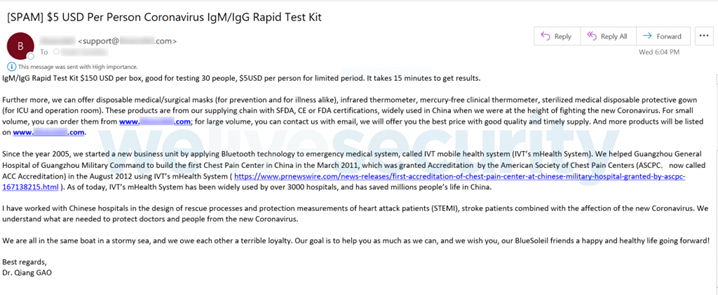 인공 호흡기, 마스크, 손 세정제 및 기타 의료 용품의 부족은 범죄자들에게 큰 이득이 되었습니다. 그들의 비열한 사업은 최근 호황을 누리고 있는데, 특히 사기성 “코로나 치료제”를 제공하고 있기 때문입니다. 그들 중 일부는 가짜이거나 존재하지 않는 코로나 바이러스 테스트 키트를 인증 받은 의료 관계자인 것처럼 가장하여 제공하기 시작했습니다. 미국 식품의약국(FDA)은 이 판매자들을 엄하게 단속하고 있으며, 사람들이 자가 테스트를 위해 구입할 수 있는 어떤 검사도 승인하지 않았다고 경고하고 있습니다.