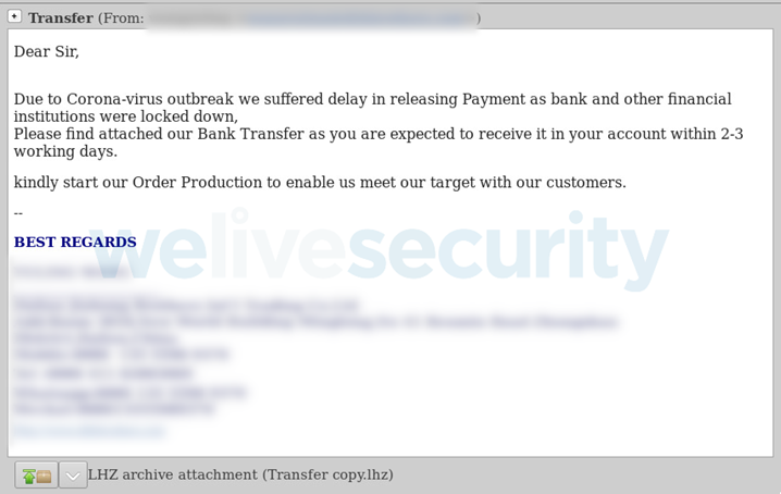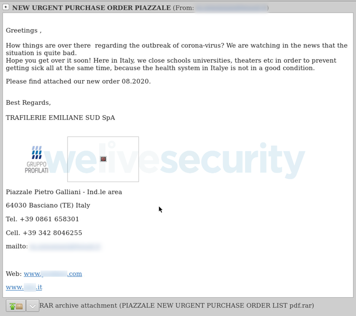그들의 전술의 예는 첨부 파일이 질병으로부터 여러분을 보호하는 데 도움이 되는 관련 정보가 포함되어 있다고 주장하는 이메일을 통해 연락하는 것입니다. 아래의 특정 캠페인에서 ESET 연구원은 첨부 파일에 개인 데이터를 도용하도록 설계된 트로이 목마가 포함되어 있음을 발견했습니다.
