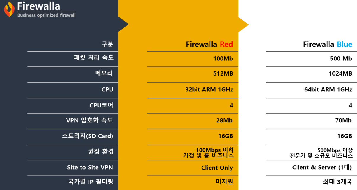 FIREWALLA BLUE : 인터넷 속도 500Mbps 이하, 50이하 디바이스 사업장에 적합합니다.