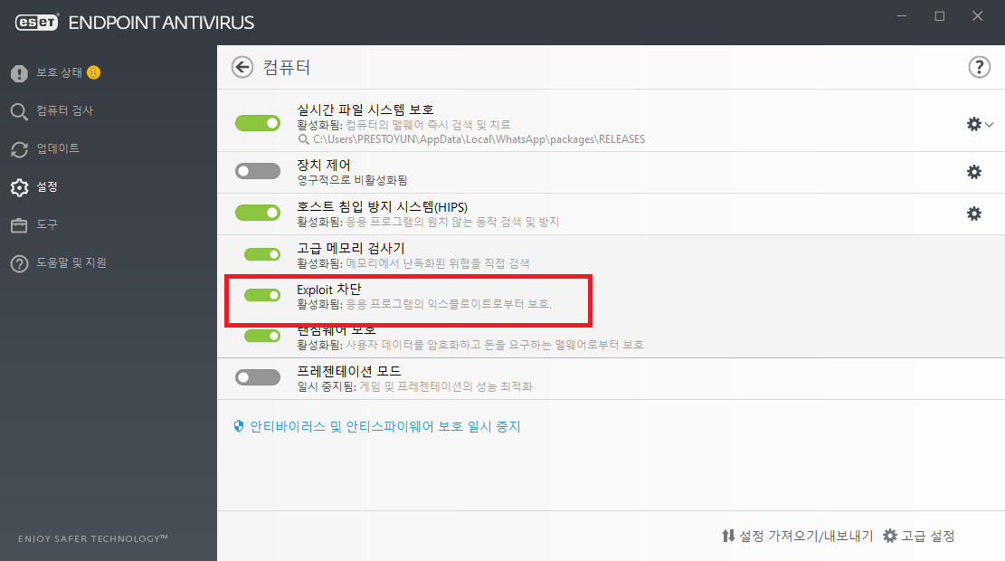 패치를 잘 적용하는 거 외에도 보안 솔루션이 익스플로잇 형태 행위에 대한 보호 계층이 켜져 있는지 확인하는 것이 중요합니다. 윈도우용 ESET 엔드포인트 제품에는 익스플로잇의 의심스러운 활동에 대한 프로세스를 모니터링하는 익스플로잇 차단 모듈이 기본적으로 활성화되어 있습니다.