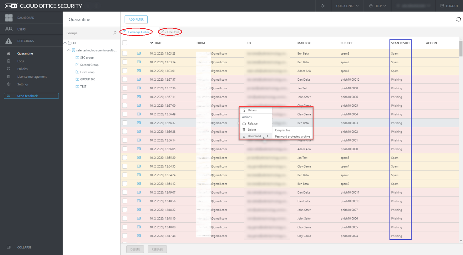 ECOS는 의심스러운 이메일을 격리하고 알림을 자동으로 트리거해 관리자가 즉각적 수정을 할 수 있도록 합니다. 여기에는 격리된 이메일에 대한 추가 세부 정보를 확인하고 삭제나 해제할 수 있는 기능이 포함되어 있습니다. 관리자는 감지된 항목을 자동으로 삭제하거나 정크 또는 휴지통 폴더로 이동하도록 EOS를 설정할 수 있습니다.