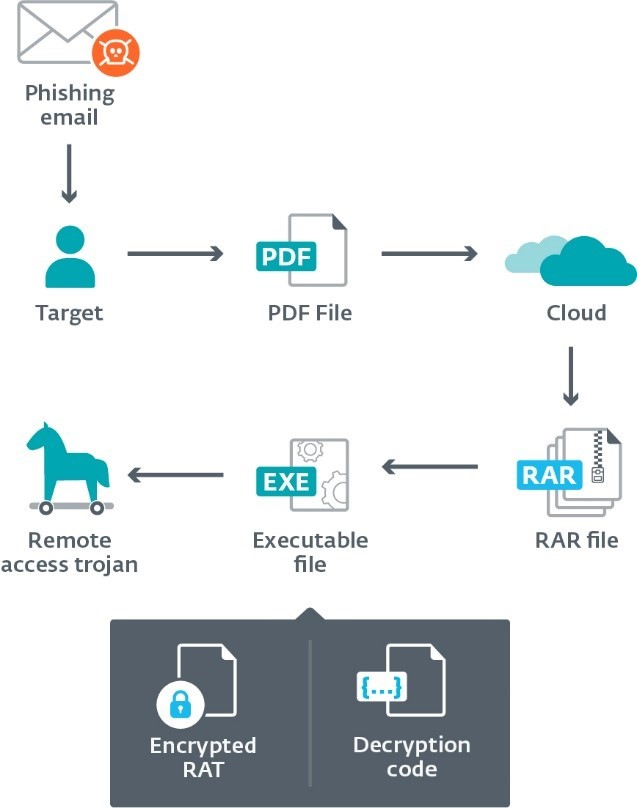 이들은 악성 파일의 다운로드를 유도하는 이메일을 통해 표적에 접근합니다. 대부분의 경우 이러한 이메일에는 사용자가 클릭해야 하는 링크가 포함된 PDF 문서가 첨부되어 있습니다. 다운로드된 파일은 내부에 실행 파일이 있는 일반 RAR 압축 파일입니다. 이러한 압축 파일은 OneDrive 또는 MediaFire와 같은 합법적인 파일 호스팅 서비스에서 호스팅 됩니다. 피싱 이메일은 필수 COVID-19 테스트를 실시하거나, 법원 청문회에 참석, 또는 교통 벌금을 지불하라는 통보가 될 수도 있고, 은행 계좌 동결과 관련된 것일 수 있습니다.