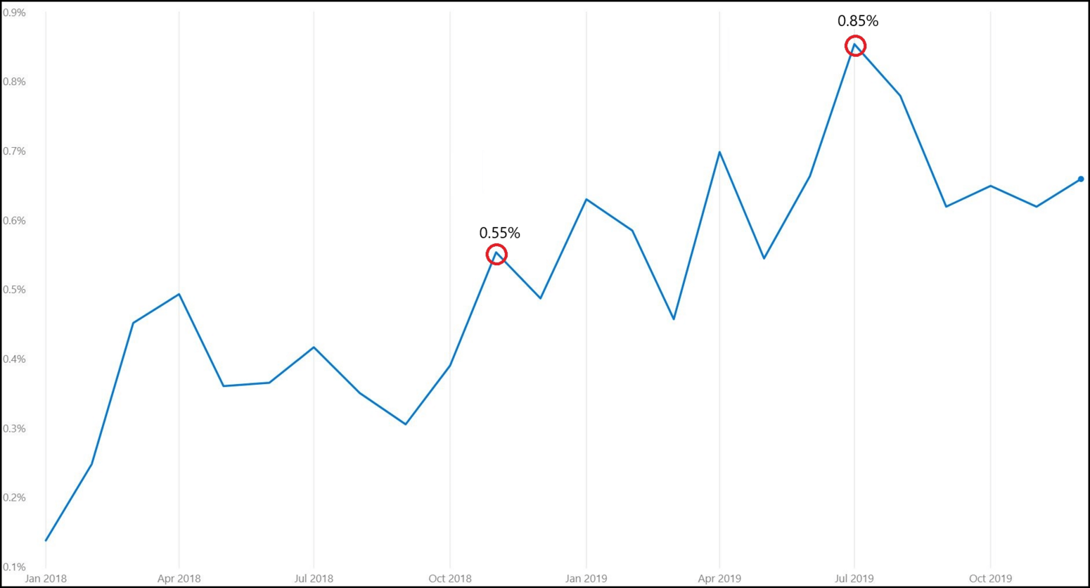 2018년에 MS는 피싱과 악성코드에 대해 매달 4천7백 건 이상의 Microsoft 365 이메일을 검사했습니다. 전체 인바운드 이메일 중에서, 2018년 피싱 이메일 탐지율이 11월에 0.55%로 가장 높았고, 7월에는 0.85%로 2019년 최고점을 기록했습니다.