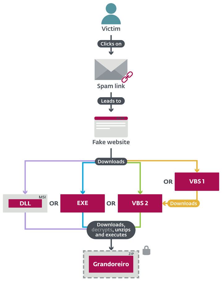 Grandoreiro는 브라질, 멕시코, 스페인 및 페루의 사용자를 타겟으로 합니다. 스팸메일을 통해 배포된 이 트로이목마는 최근 세계적으로 유행 중인 코로나19 전염병을 악용하는 가짜 웹사이트를 사용하기 시작했습니다. 또한 Grandoreiro 제작자들은 안티 맬웨어 프로그램의 탐지를 회피하기 위해 지속적인 노력을 하고 있는 것으로 밝혀졌습니다.