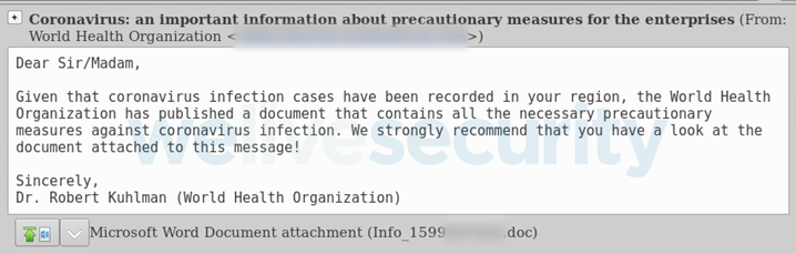 그들의 전술의 예는 첨부 파일이 질병으로부터 여러분을 보호하는 데 도움이 되는 관련 정보가 포함되어 있다고 주장하는 이메일을 통해 연락하는 것입니다. 아래의 특정 캠페인에서 ESET 연구원은 첨부 파일에 개인 데이터를 도용하도록 설계된 트로이 목마가 포함되어 있음을 발견했습니다.