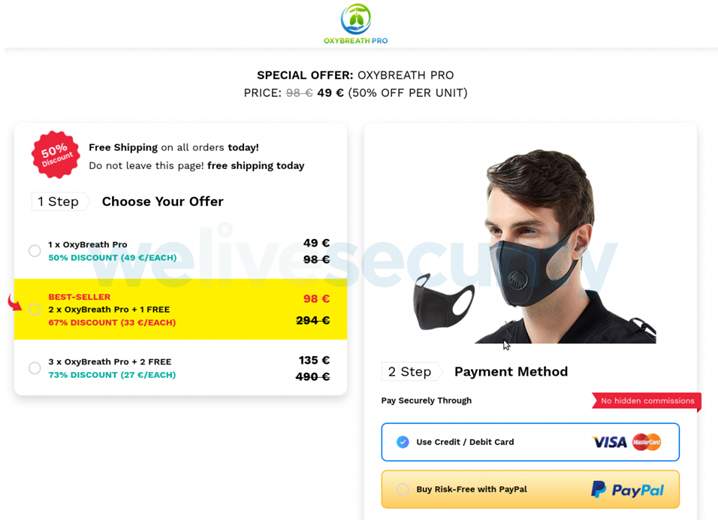 또 다른 유형의 사기 행각은 수요가 많지만 가용성이 심각하게 제한되는 제품과 관련이 있습니다. 이 경우 안면 마스크에 대해 이야기하고자 합니다. 사기성 웹사이트는 피해자들에게 "OxyBreath Pro"안면 마스크를 할인해 주고 있습니다. 안면 마스크가 부족하기 때문에, 일부 사람들에게는 이 터무니 없는 가격이 여전히 좋은 것처럼 보일 수 있습니다. 마스크를 구입함으로써 피해자는 피싱 공격에 빠지고 민감한 개인 정보를 사기범들에게 노출하게 됩니다.