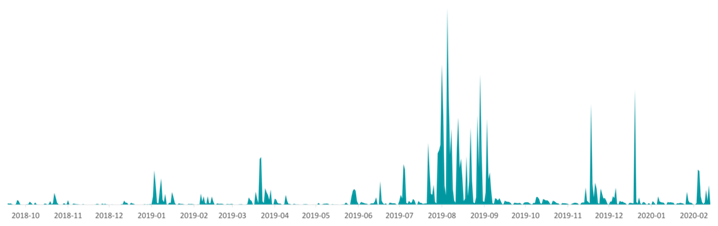 Guildma 캠페인은 ESET Research가 하루에 최대 50,000개의 샘플을 기록한 2019년 8월 이전까지 서서히 증가했습니다. 이 캠페인은 거의 2개월간 진행되었으며 10개월 전에 발견된 탐지량의 두 배 이상을 차지했습니다.