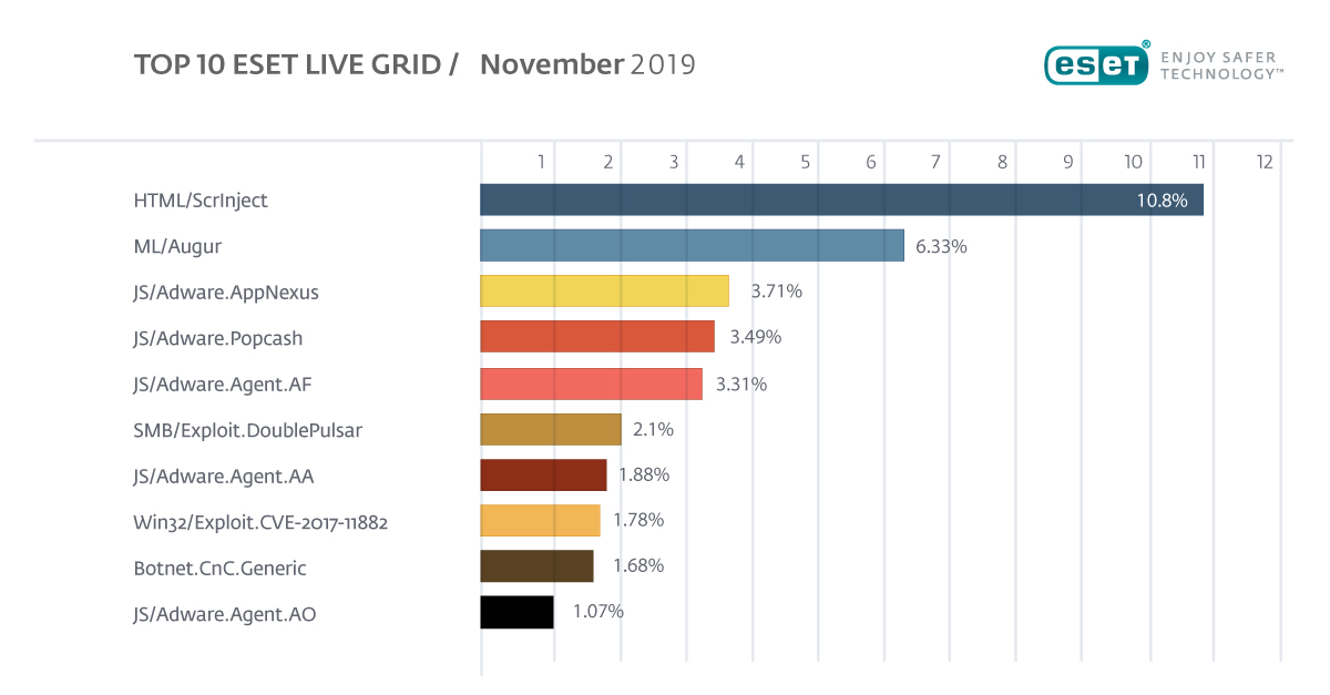 정교한 악성 코드 리포팅 및 추적 시스템인 ESET LiveGrid®의 분석에 따르면 이번 달 가장 많이 탐지된 맬웨어는 전체의 10.08 % 를 차지한 HTML/ScrInject 였습니다. 1위부터 10위까지의 맬웨어 리스트는 다음과 같습니다.